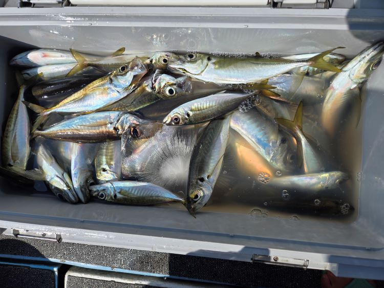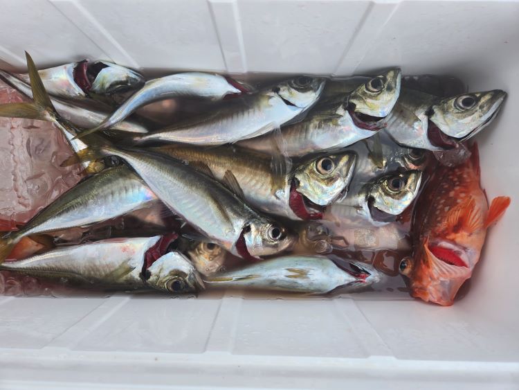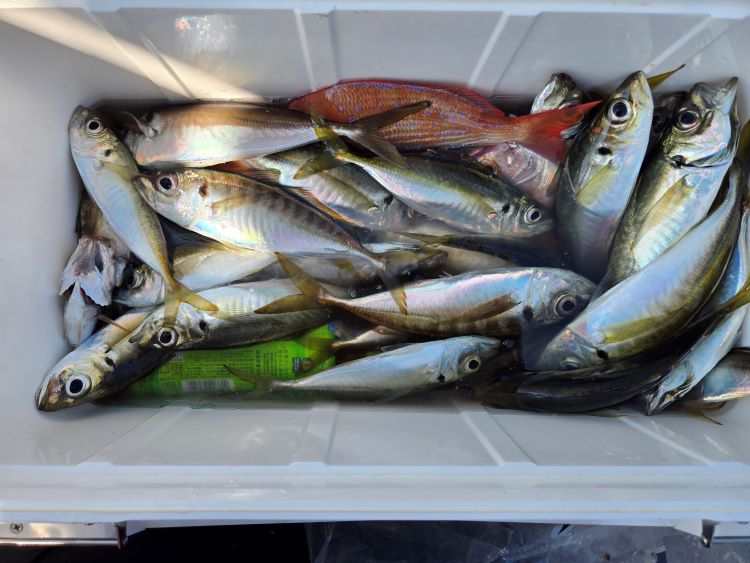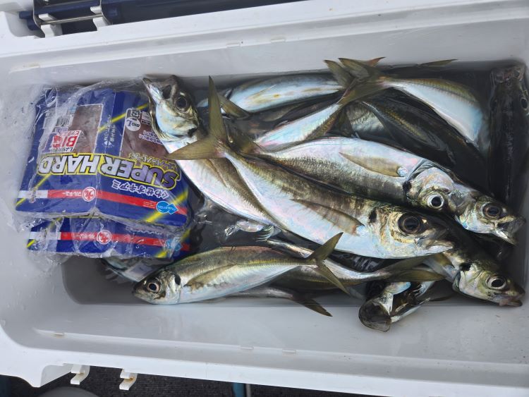 潮汐:小潮、中潮釣 果:両日とも20から30センチのアジが入れ食いでした。マダイ、ハマチ、カサゴ、カイワリも釣れました。そ の 他 :