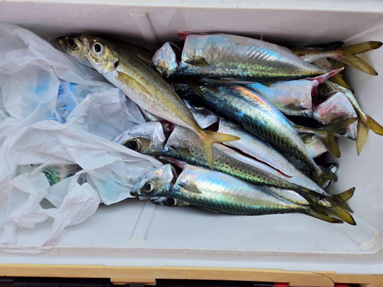 潮汐:中潮釣 果:20から35センチのアジサバを釣る人で30匹ほどでした。マダイは、船中10枚ほどでした。最大で2キロ。アジの泳がせで3キロのネイゴが釣れました。そ の 他 :