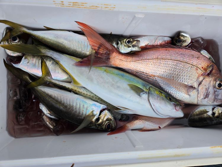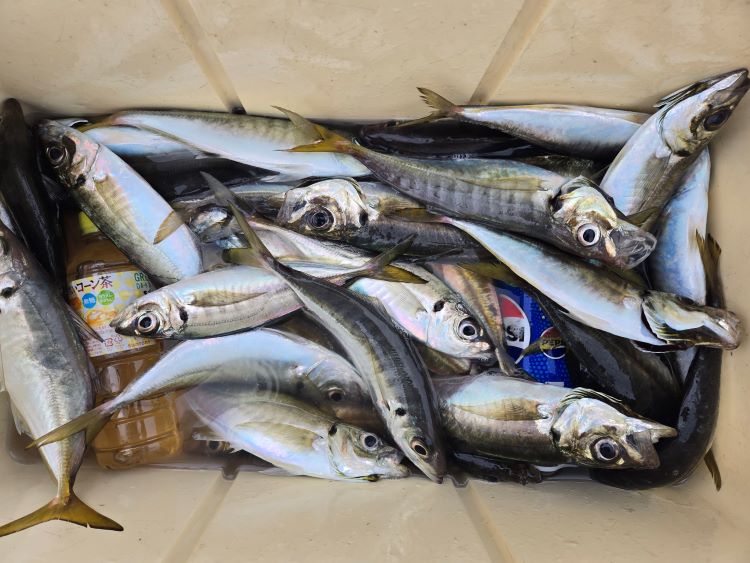 潮汐:長潮、若潮釣 果:両日とも20から35センチのアジサバが入れ食いでした。ヤズ、マダイも釣れました。そ の 他 :