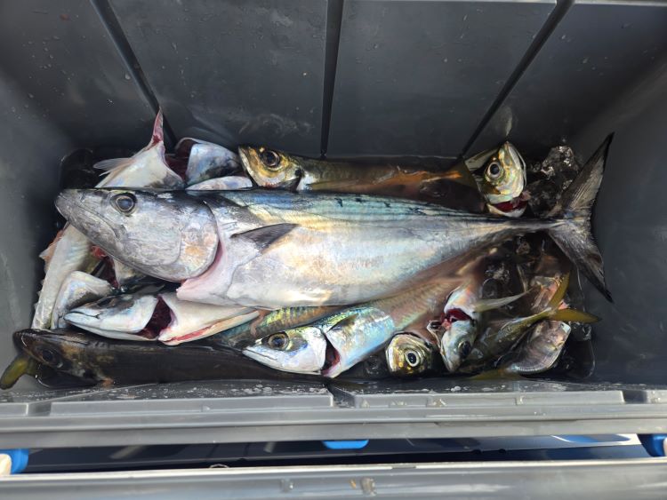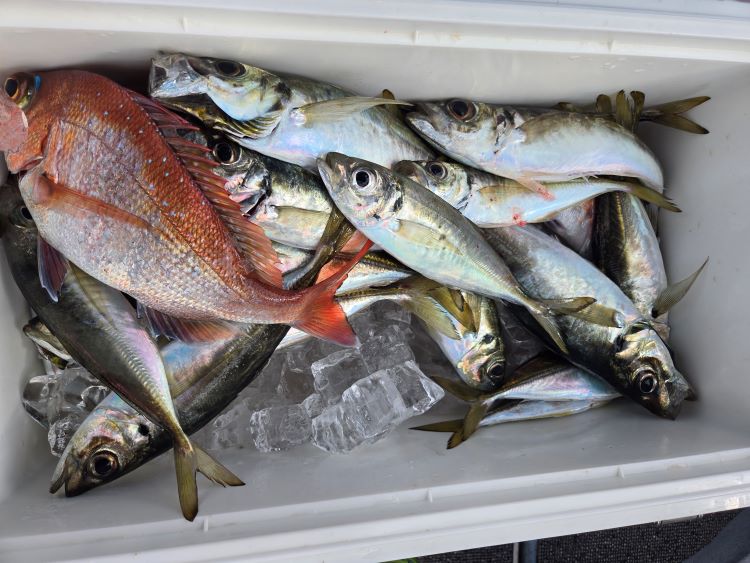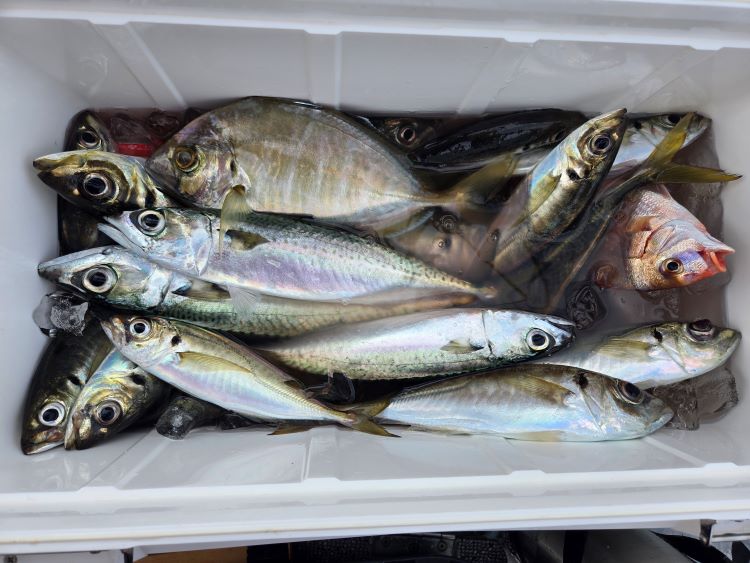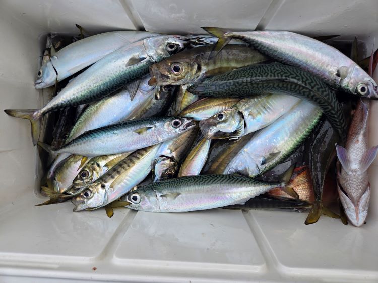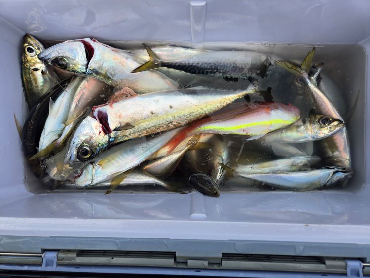 潮汐:大潮、中潮釣 果:20から35センチのアジサバが良く釣れました。釣る人で40匹ほどでした。アジの泳がせでブリ、ハガツオが釣れました。そ の 他 :