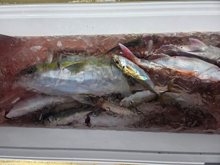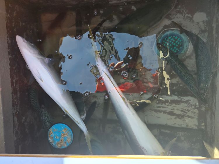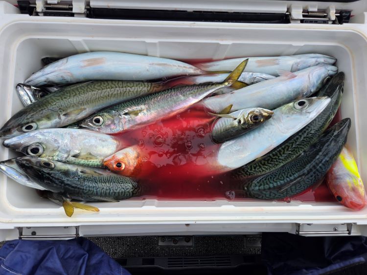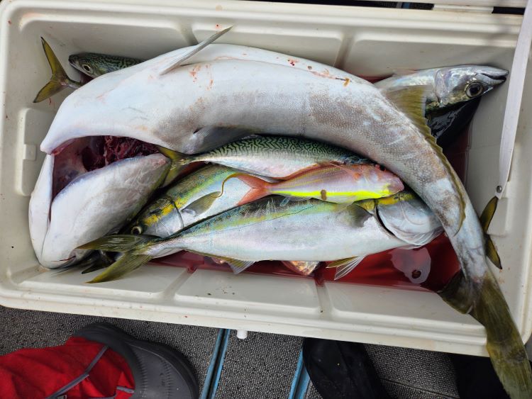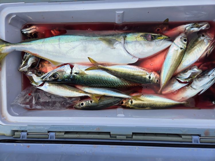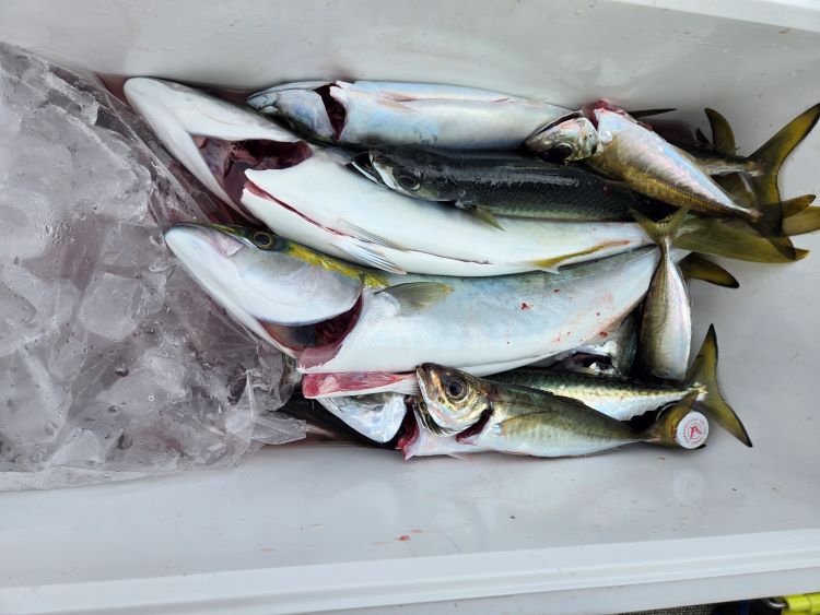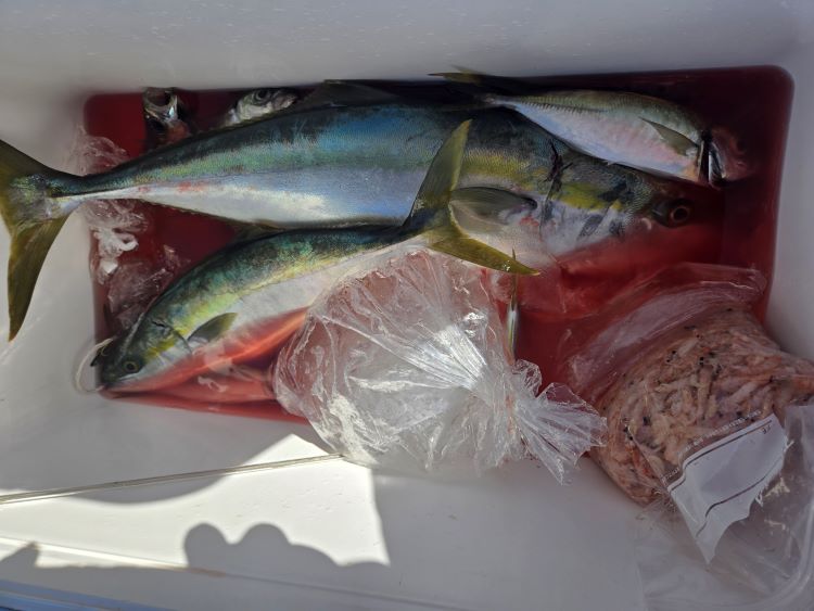 潮汐:中潮釣 果:両日ともアジの泳がせでブリ、ハマチ、ヤズが釣れました。24日は、サバが入れ食いでした。マダイは、最大で2キロでした。そ の 他 :
